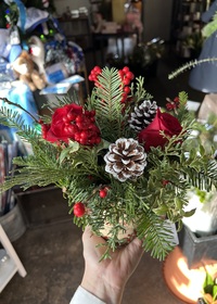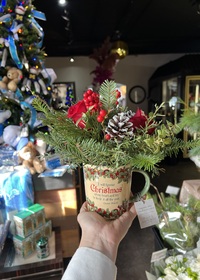 A gift to keep plus fresh flowers! Designed exclusively for The Flower Alley, gorgeous evergreens and red roses designed in a keepsake Christmas Carol mug