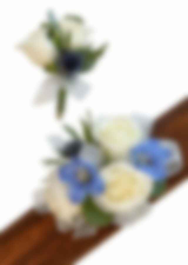White premium florals mixed with light blue delpheninum and thistle. This is a matching corsage and boutonnière set