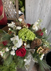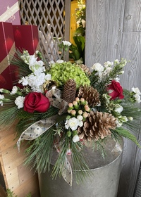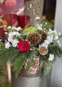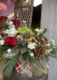 $100.00A gorgeous and full traditional Christmas styling with a mix of long lasting and premium seasonal flowers, holiday ornaments and pine cones in a plaid in a keepsake tartan plaid container