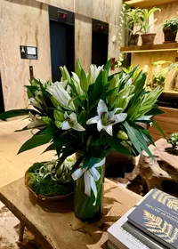A striking display of (10) gorgeous stems of white lilies amongst modernly greenery in a sleek cylinder vase