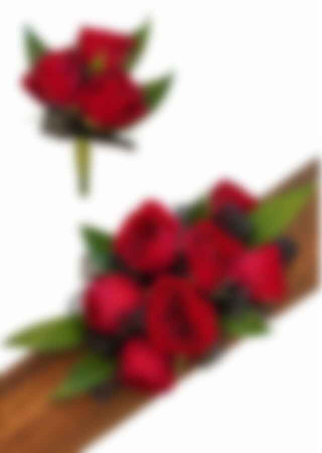 Red small spray roses with black ribbon perfectly paired together for a red + black matching corsage and bouronniere set for prom