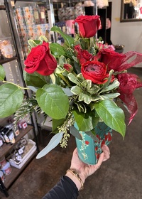 Accented by red ranaculus and red roses