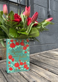 A keepsake novel vase featuring Romeo and Juliet designed with spring romantic blooms of roses and tulips accented with fresh greens