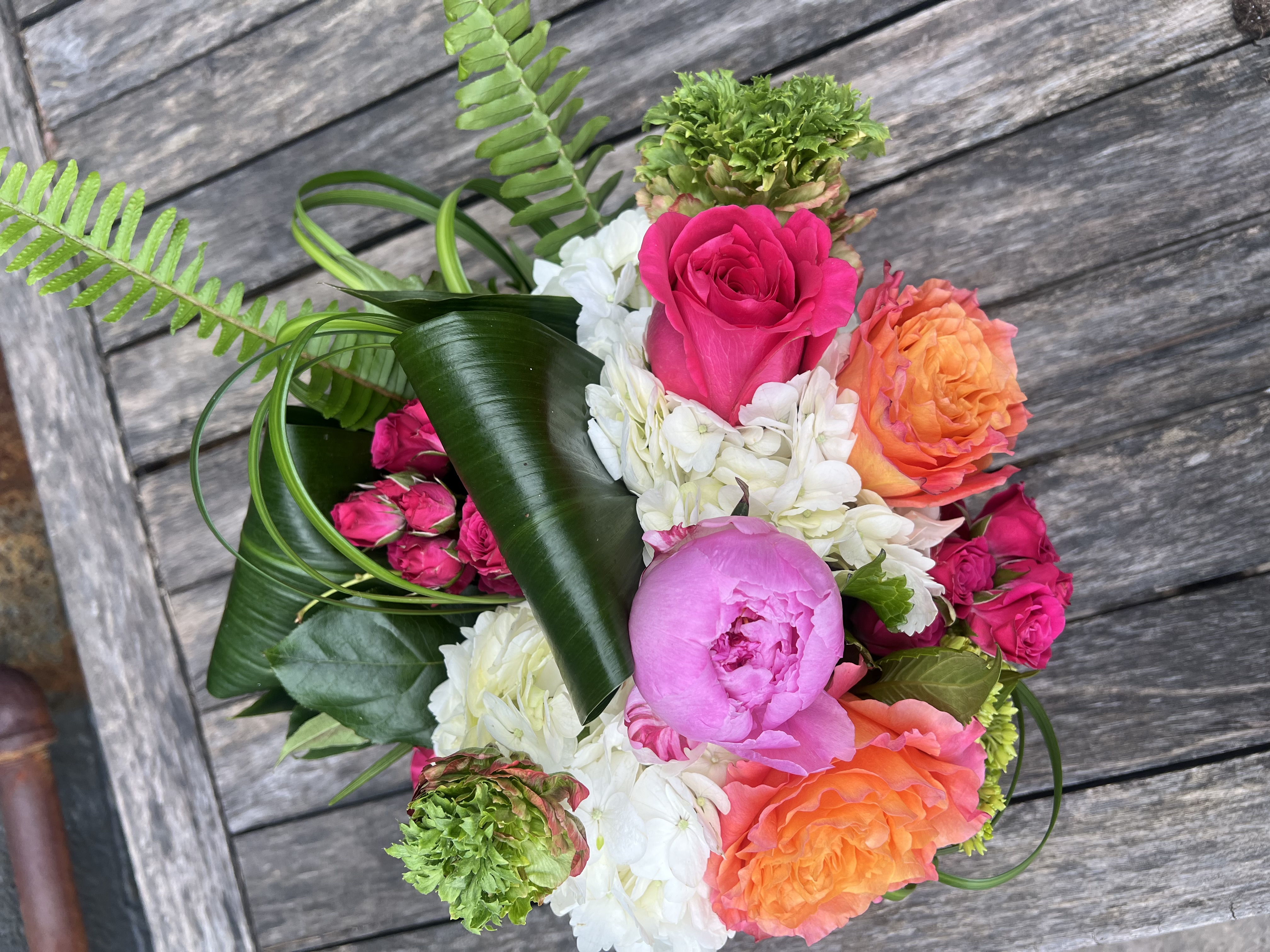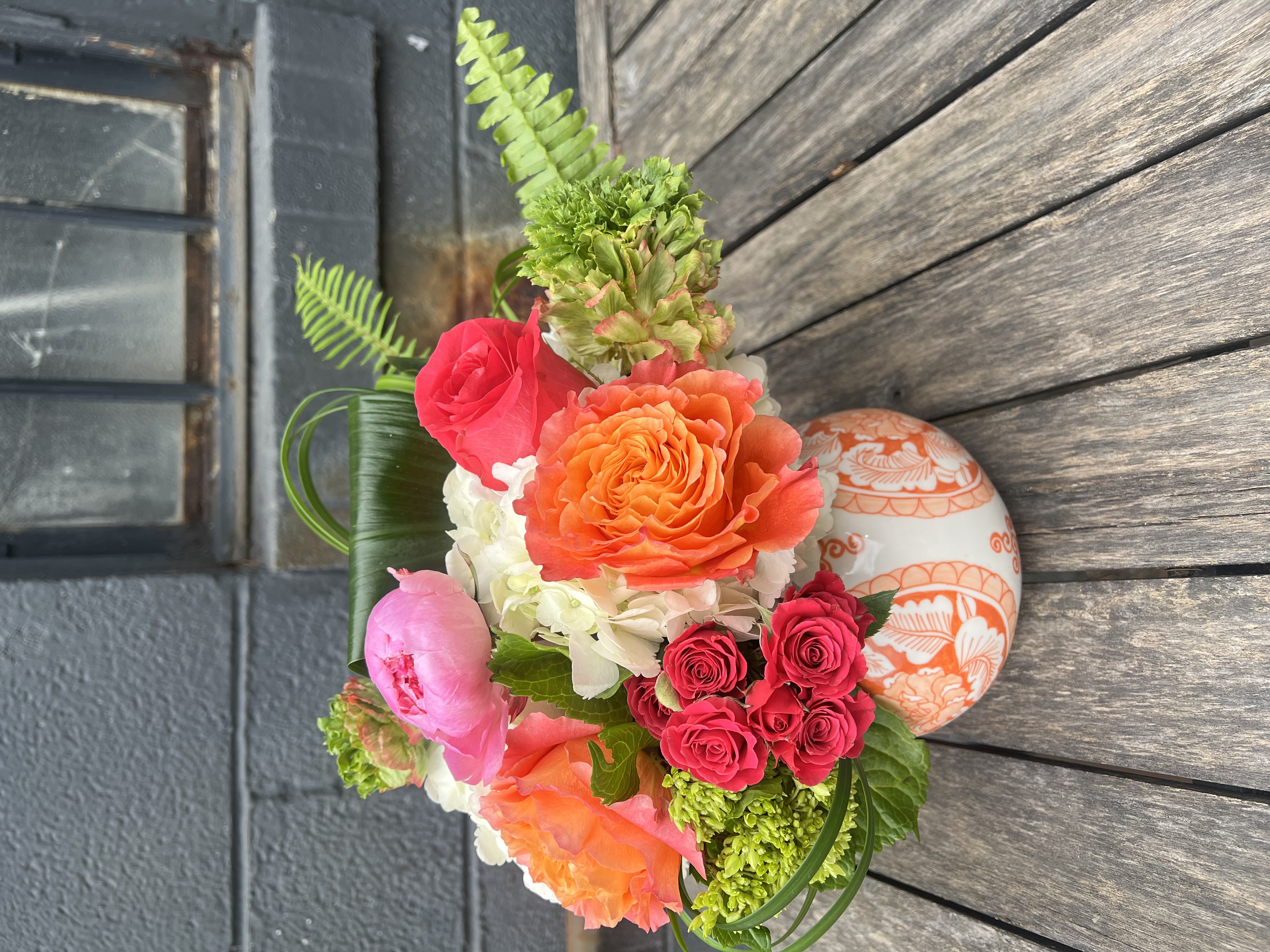 $135.00Shades of vibrant pink, oranges, chartreuse green and white fill this chic spring floral arrangement. Designed with large roses, spray roses, hydrangeas and peonies in a keepsake orange and white ceramic container