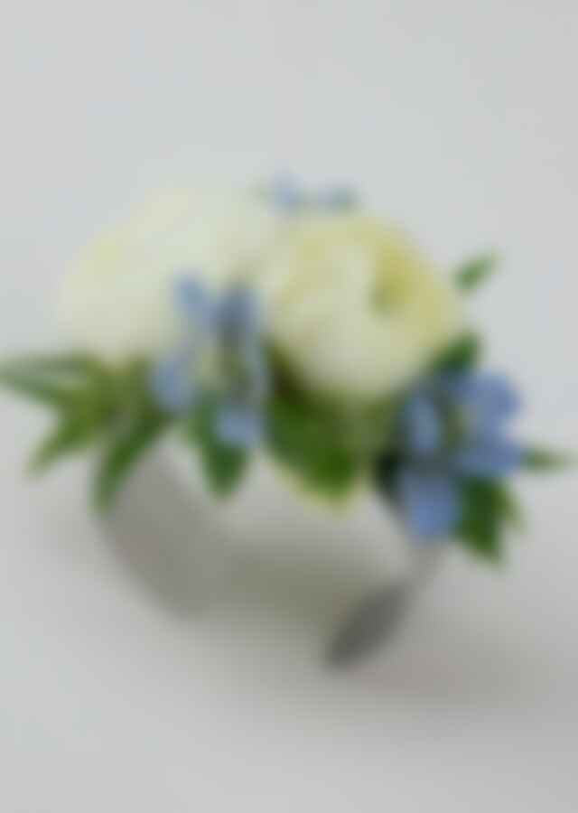 $50.00Trendy corsage style incorporating white ranunculus and light blue delphenium with elegant greens